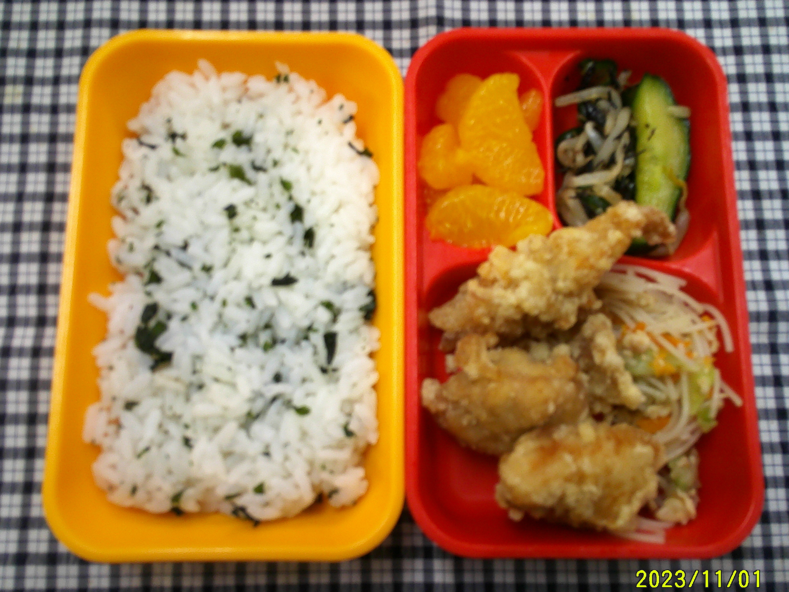 わかめごはん 若鶏の唐揚げ 焼きビーフン