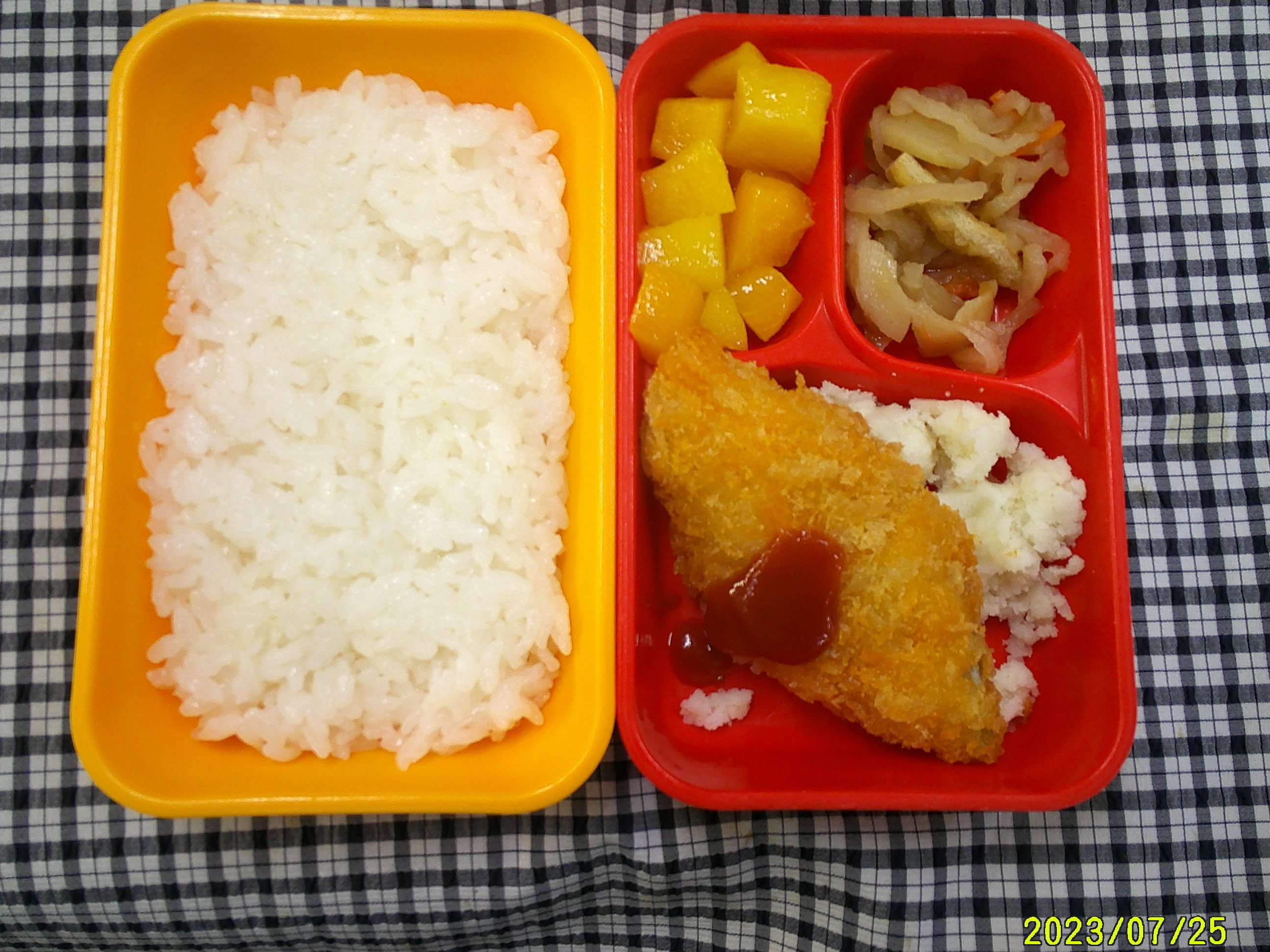 ごはん 白身魚フライ マッシュポテト 切干大根の煮物 ピーチ缶