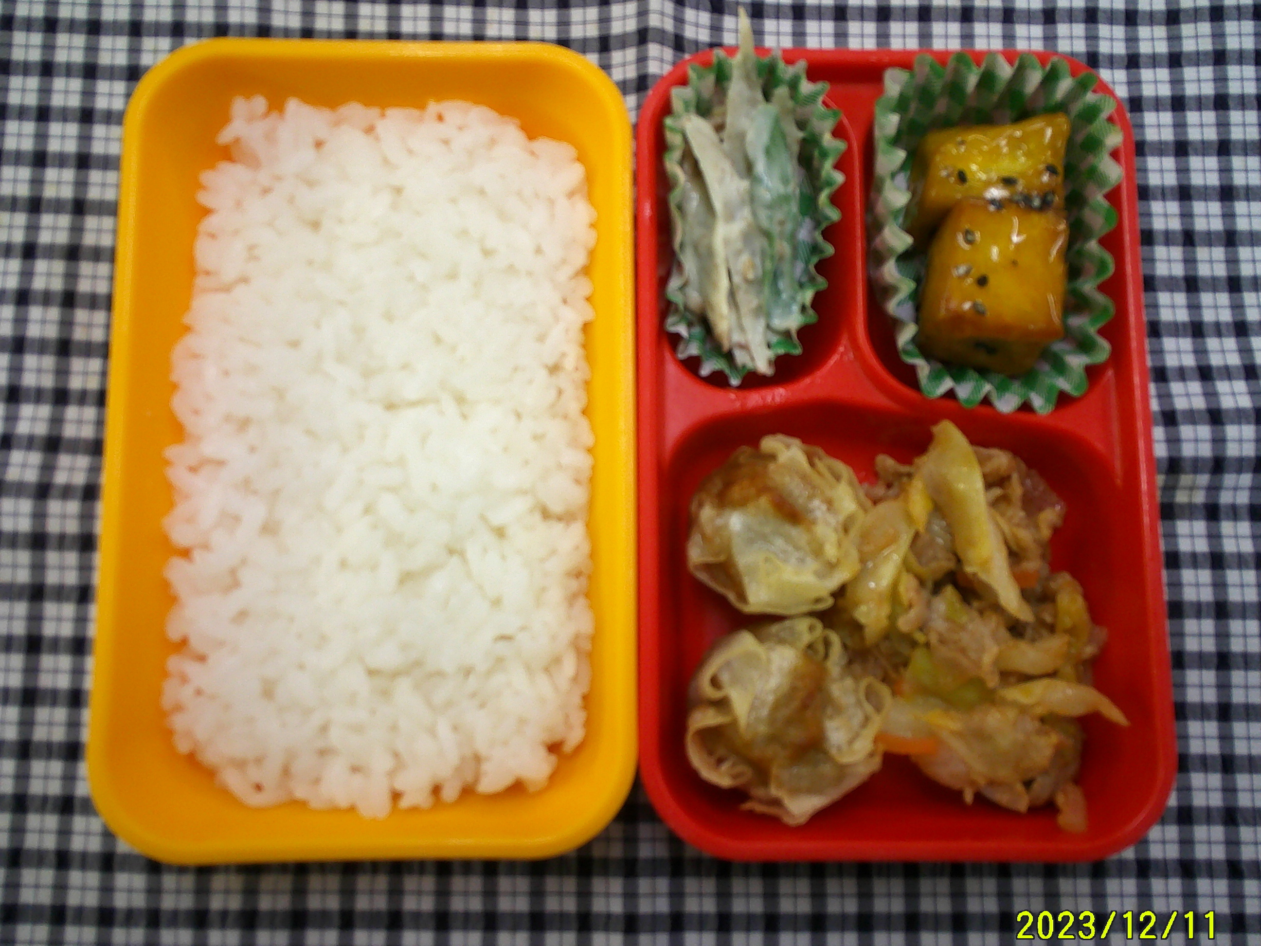 ごはん ポークチャップ 揚げシュウマイ ごぼうサラダ 大学芋