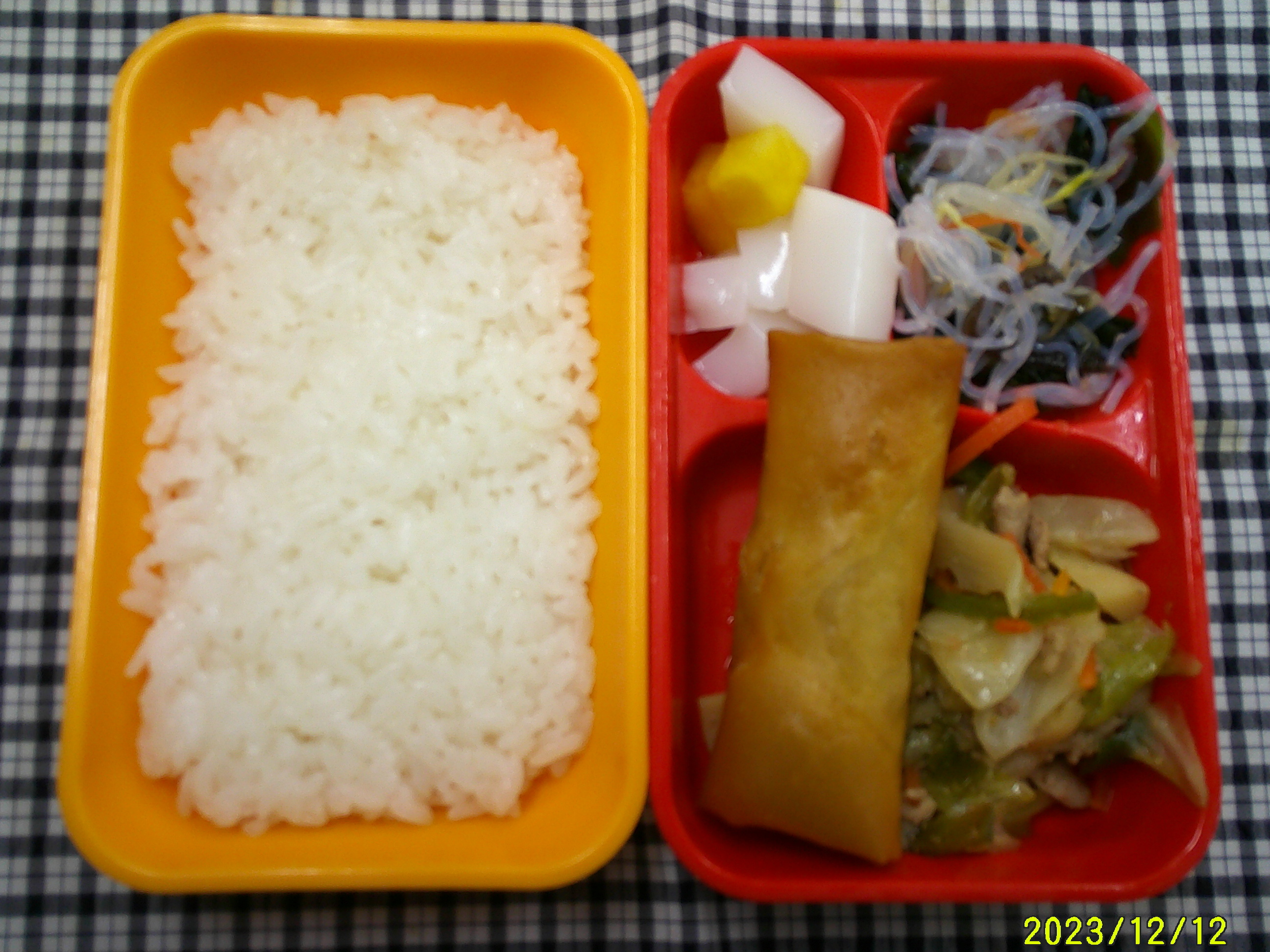 ごはん 春巻き チンジャオロース 中華サラダ 杏仁&ピーチ缶